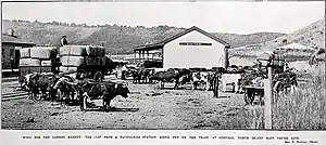 A plan for the proposed station was made in 1903. Tenders were invited on 4 March 1907.[14] On 7 June 1907 a contract was let to A S Johnston of Hunterville for £2,201.0s.7d and the station was built by January 1908. When opened it was 66 ft (20 m) by 14 ft (4.3 m), with rooms for stationmaster, luggage, a lobby, urinals and ladies, on a 240 ft (73 m) by 15 ft (4.6 m) platform. There was also a 40 ft (12 m) by 30 ft (9.1 m) goods shed with verandah, a loading bank, cattle yards, two 4,000 imp gal (18,000 L) water tanks and a cart approach. Cottages for railway staff were built from 1904 to 1955. A crossing loop could take 54 wagons and a snowplough was kept at the station.