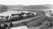 Associated with the Hawkesbury River railway station is the now defunct River Wharf railway station. This was located on the eastern end of Long Island, across the causeway linking Long Island with the mainland and was in use from at least 15 August 1887.[4] River Wharf was the terminus of the northern line until the first Hawkesbury River Railway Bridge opened in 1889. During its operation, trains would disgorge passengers and goods here for transfer to the General Gordon paddle steamer.