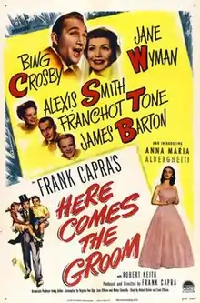Here Comes the Groom is a 1951 American musical romantic comedy film produced and directed by Frank Capra and starring Bing Crosby and Jane Wyman. Based on a story by Robert Riskin and Liam O'Brien, the film is about a foreign correspondent who has five days to win back his former fiancée, or he'll lose the orphans he adopted. Filmed from late November 1950 to January 29, 1951, the film was released in the United States by Paramount Pictures on September 20, 1951.[2]