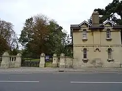 The entrance gates to the gardens are Grade II listed.[5] They were formally the entrance to the grounds of Hillfield House and are accessible from London Road. The gates are made up of 5 Ashlar stone pillars supporting a pair of wrought iron gates for vehicles, and a single wrought iron gate to the right hand side for pedestrians. The pillars have moulded bases, a recessed panel on each side, and moulded cornices and capstones. Railings with short pillars topped with moulded copings link the main pillars. The lower half of the iron gates are decorated with circular patterns, and the top half has vertical poles decorated with finials. A short length of solid stone railing links the far right hand pier with the gate lodge.[6] In 2013, The gates were renovated, costing £14,000. The stone pillars were cleaned and repaired and new railings were fitted. The iron gates were cleaned, repaired and repainted.[7]