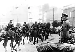 At the very beginning of the war, Łódź was a target of German aggression. The first German bombs fell in the area of Kaliska Railway Station and at Lublinek Airport outside the city. During the first week of occupation, economic life in Łódź came to a halt. German Luftwaffe raids completely disorganized the work of shops, offices, and various other institutions. Polish Air Force and anti-aircraft artillery, which were insufficient in quantity and strength, were not able to effectively counteract the brutal attacks of the enemy.[17] On September 5, German troops smashed both wings of the Łódź Army during the Battle of Łódź and opened their way to the city. The previous day, wealthier residents began to leave the city. Military and state authorities - headed by voivode Henryk Józefski and the town staroste Henryk Mostowski, self-government with president Jan Kwapiński and the police left the city as well, and on the night of 4–5 September the evacuation of offices and institutions began a process which lasted until noon on September 6. The city was deprived of all means of transport. Ambulances and fire brigade equipment were also taken away. At the same time, the inhabitants fled from Łódź en masse, following the Brzeziń road to Warsaw. German aircraft fired on evacuating civilians, causing casualties among defenseless refugees.[18]