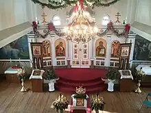 The Holy Resurrection Orthodox Church was designed by John Bergesen, an architect from New York City. The church was built with six onion domes, which was common in Russian architecture of that period. The dimensions of the church are 36 by 63 feet (11 by 19 m), which does not include the main entrance, and a height of approximately 100 feet (30 m). The inside of the church is divided into three parts: the vestibule, the nave, and the sanctuary.[2] Its icons were some of the last ones to leave Russia before Czar Nicholas II was overthrown.