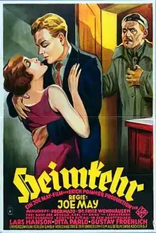 Homecoming (German: Heimkehr) is a 1928 German silent war drama film directed by Joe May and starring Lars Hanson, Dita Parlo, and Gustav Fröhlich. A sound version was prepared with the help of Paramount Pictures. While the sound version has no audible dialog, it was released with a synchronized musical score with sound effects using both the sound-on-disc and sound-on-film process. The sound version was more widely exhibited then the silent version due to the general public's apathy to silent films.