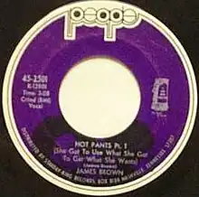 "Hot Pants (She Got to Use What She Got to Get What She Wants)" is a funk song by James Brown. Brown recorded the song in 1971 and released it that year as a three-part single on his People Records label, which was then distributed by his primary label King. It was a number-one R&B hit and reached number fifteen on the Billboard Hot 100[1] pop chart in the U.S. along with reaching number ten on the Cashbox[2] magazine charts.[3][4] "Hot Pants" was Brown's final release under King's purview before he (and the People label) moved to Polydor Records. The song's lyrics are an ode to the captivating power of the title garment, which members of the band first saw on their 1970 European tour.