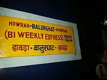 The Howrah – Balurghat Bi-Weekly Express is an Express train belonging to Eastern Railway zone that runs between Howrah Junction and Balurghat in India. It is currently being operated with 13063/13064 train numbers on bi-Weekly basis.[1][2][3]