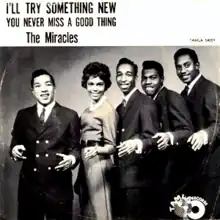"I'll Try Something New" is a song written by Smokey Robinson and originally released in 1962 by The Miracles on Motown Records' Tamla subsidiary label. Their version was a Billboard Top 40 hit, peaking at #39, and just missed the Top 10 of its R&B chart, peaking at #11. The song was released later as a joint single by Diana Ross & the Supremes and The Temptations, also becoming a charting version on the Billboard 100 pop singles chart, peaking for two weeks in April 1969 at number 25.[1][2]