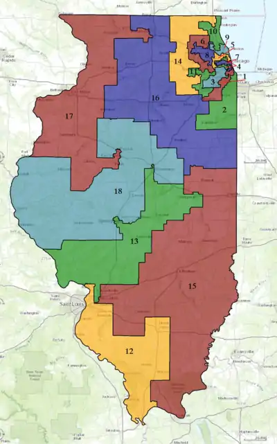 Illinois is divided into 17 congressional districts, each represented by a member of the United States House of Representatives. The majority of Illinois' districts are located in the Chicago area.
