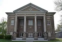 Iowa Yearly Meeting House-College Avenue Friends Church is a historic church building located in Oskaloosa, Iowa, United States. The Colonial Revival structure was designed by Bloomington, Illinois architect A. T. Simmons, and completed in 1913. As their membership declined, Quakers in Iowa decided to concentrate on a few fundamental tenets of their faith, but gave way on their traditional concerns about simplicity and restraint.[2] This more elaborate building replaced a simple 2½-story, brick and stone structure that was completed in 1865. The building project was a cooperative arraignment that included the Yearly Meeting, the Monthly Meeting, and nearby William Penn College. Oskaloosa had been chosen as the location of the Iowa Yearly Meeting, or the denominational headquarters, because of its central location to where the Quakers settled west of the Mississippi River. The previous building had separate meeting facilities for men and women, and this one does not. That separation was no longer considered necessary by the time this building was built.[2] It was listed on the National Register of Historic Places in 1996.[1]