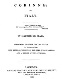 - ↑ Staël (Anne-Louise-Germaine), Madame de (1838). Corinne; or, Italy ... Translated ... by Isabel Hill; with metrical versions of the odes by L. E. Landon; and a memoir of the authoress. Richard Bentley.