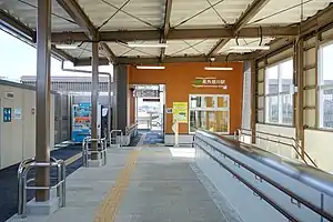 The station's ticket gate is located within an island platform placed between the inbound and outbound lines. It is accessed by an underpass that links the opposing sides of the station. The underpass is free to pass through to provide a pedestrian pathway across the rail line.[4]