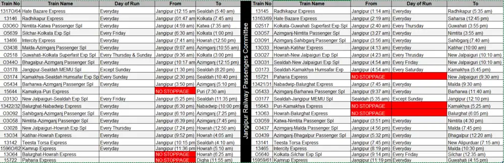 - 02517/18 Guwahati-Kolkata-Guwahati Summer Special Express, 03129/30 Sealdah-New Jalpaiguri-Sealdah Bi-weekly Summer Special, 02307/08 Howrah - New Jalpaiguri - Howrah Summer Special Express, 03101/02 Sealdah-Kamakhya-Sealdah Humsafar Express, 05639/40 Silchar-Kolkata-Silchar Special Express have been given stoppage at Jangipur station w.e.f 22/06/2022.