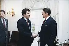 Rowland served three terms representing Connecticut's 5th congressional district in the United States House of Representatives from 1985 to 1991.[1][2] A Republican, he was the first Connecticut governor to be elected to more than two terms since Wilbur Cross, who was elected to four consecutive terms in the 1930s. In July 2004, Rowland resigned from office amid a corruption investigation, and later pleaded guilty in federal court to a one-count indictment for conspiracy to commit honest services fraud, mail fraud and tax fraud.[3] His lieutenant governor, Jodi Rell, replaced him as governor. Rowland served ten months in a federal prison until February 2006, followed by four months' house arrest at his home in West Hartford until June 2006.