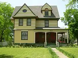 The John W. Gibson House, constructed in 1896, is a three-story Dutch Colonial Style Home owned and built by John Gibson, cattleman and banker. It was listed on the National Register of Historic Places in 1982. The house is one of the oldest pre-statehood houses in Wagoner. Gibson was president of the First National Bank in Wagoner for 26 years.[1][3] The home features three stories plus a basement. From an opening in a third story bedroom floor, a brass fireman's pole serves as an emergency fire exit for the two bedrooms, loft and bath on the third story. The fireman's pole lands in the middle of the second story library nook. There is a wrap-around porch as well as a second porch off of the back entrance. The home was lovingly restored to historically accurate paint colors on the exterior during the early 2000s. Many of the interior fixtures have been updated, all in accordance with historical accuracy guidelines.