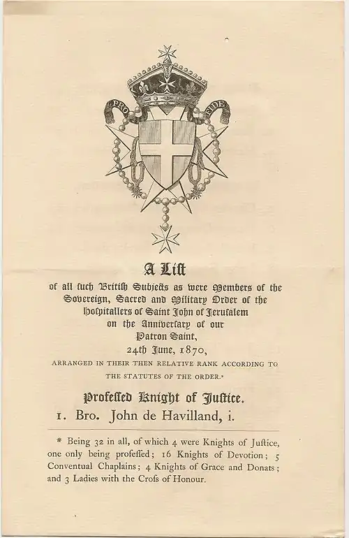 In 1872, John de Havilland was made a fellow of the Society of Antiquaries of London. He is also remembered as a soldier of fortune who served in Spain under Don Carlos where he became a General in the Spanish Army. According to a College of Arms Monograph, he was of uncommon physical strength and one of the most picturesque characters in the history of the College of Arms.