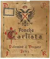 As the marriage of Juan José Palomino and Isabel Vergara was parallel to merger of Palomino and Vergara winegrowing businesses, he was possibly expected to take over the joint enterprise. Since the mid-1920s the press referred to the "Palomino y Vergara bodega"[84] or to "señores Palomino y Vergara" as owners and managers, but it is not clear whether the Palomino in question was Juan José or his father.[85] The first identified appearance of the Palomino & Vergara brand is dated on 1931.[86] None of the sources consulted clarifies when Juan José Palomino became the key decision-maker in the enterprise; his father-in-law was active until 1935[87] and this is also the last time when the press referred to "señores Palomino y Vergara".[88] In the late 1930s the company was entirely aligned with Palomino's Carlist political preferences; its beverages were named “Margaritas”,[89] “Tradicionalista”,[90] “Requeté”[91] and “Carlista”;[92] some of these products were marketed until the early 1940s.[93]