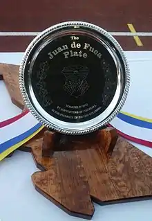 The Juan de Fuca Plate was established in January 2012 by supporters of the Victoria Highlanders and Vancouver Whitecaps U-23 (Lake Side Buoys, Vancouver Southsiders, and Curva Collective),[1] inspired by the Voyageurs Cup and Cascadia Cup to recognize high-level soccer in the province of British Columbia.[2] The trophy was funded through the donations of 24 fans of the two clubs to purchase the plate, which has a base made of BC maple in the shape of the province, as well as a banner to be displayed at matches.[3] It was named after the Strait of Juan de Fuca and the Juan de Fuca Plate, which are located just off the coast of British Columbia.[4] From its creation, the trophy was not tied to any specific league and meant to be awarded to the best British Columbia team in the top level non-professional league with multiple teams, based on their matches against each other, which at the time was the Premier Development League.[2]