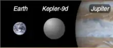 Kepler-9d (formerly known as KOI-377.03) is a planet in orbit around the Sun-like star Kepler-9. Initially discovered by Kepler spacecraft, a terrestrial planet-searching satellite built and operated by NASA, Kepler-9d is most likely a Super-Earth, with an estimated radius approximately 60% larger than that of Earth's, although its exact mass cannot be determined. Kepler-9d orbits Kepler-9 every 1.56 days at a distance of .0273 AU from its star, an extremely close distance. Although Kepler-9d is the closest planet to its star in its system, it is named Kepler-9d instead of Kepler-9b because two gas giants, Kepler-9b and Kepler-9c, were confirmed first. The original studies into the system first suggested that Kepler-9d might be a planet, but a follow-up investigation made by the Kepler team later confirmed that it was; the confirmation of Kepler-9d as a planet was made public with the team's paper, which was published in the Astrophysical Journal on January 1, 2011. The team used telescopes at the W.M. Keck Observatory in Hawaii to follow up on the Kepler space telescope's initial discovery.