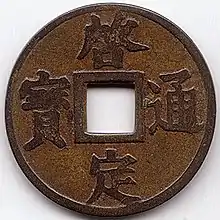 - ↑ Commonly written as "啓定通寶" in modern sources.