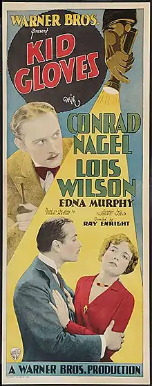Kid Gloves is a 1929 American sound part-talkie pre-Code drama film directed by Ray Enright, and starring Conrad Nagel, Lois Wilson, Edward Earle, Edna Murphy, and Maude Turner Gordon. In addition to sequences with audible dialogue or talking sequences, the film features a synchronized musical score and sound effects along with English intertitles. The soundtrack was recorded using the Vitaphone sound-on-disc system. The film was released by Warner Bros. on March 23, 1929.[1][2][3]