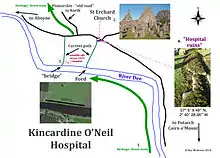 There is no certainty with regard to the Hospital or its location. The first reference to a hospital being built comes from the 1233 Charter by Alan the Durward. Confirmatory evidence can be found in 1296 in the Second Ragman Roll.[Note 3] On 28 August 1296 " …Wautier master of the hospital of Kincardine ou Neel …" signed the Roll at Berwick on Tweed.[7][Note 4] Two possible sites have been identified. Most likely, it was founded by Alan or Thomas Durward between 1241 and 1244 abutting St Erchard's Church.[Note 5] It was later built near St Mary's Church – the "Auld Kirk" in Kincardine O'Neil. In 1330 the hospital and its church was erected into a prebend of Aberdeen Cathedral. It may have stood in a field known locally as "Bladernach" near a 19th-century ferryboat station on the river Dee at NO 5874 9933. There was no local knowledge of Bladernach in June 1972 when visited by the Ordnance Survey. The following description comes from Places of Worship in Scotland:[9]
