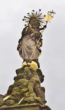 This iconography is based on the motif of "Our Lady of Victory," which became popular in the 17th century in the course of the Counterreformation. In the Heidelberg context, the slaying of the monstrous snake was intended as an allegory for the battle against the Protestant "erroneous belief."[5] Other attributes of the sculpture point to various aspects of the Mary cult: the crown of rays with twelve stars and the lilies recall the immaculate conception. Crown and sceptre symbolise Mary's role as queen of heaven. The trampling of the snake and the crescent moon at her feet are symbols of her role as the Woman of the Apocalypse. The putti in the clouds stand for the Assumption of Mary and the rays of light in the clouds are the rays of mercy, which Mary sends to the world.[5]