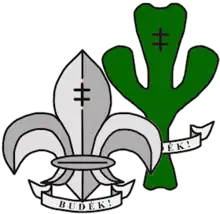 The Scout Motto is Budek, translating as Be Prepared in Lithuanian. The Lithuanian noun for a single Scout is Skautas.