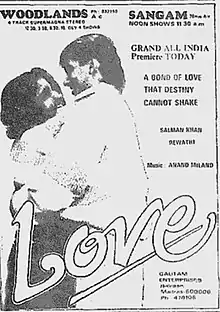Love is a 1991 Indian Hindi-language romance film directed by Suresh Krissna, starring Salman Khan, Revathi (in her Bollywood debut) in the lead roles. It is the remake of the Telugu film Prema (1989).[1] It could not repeat the success of the original and ended up as an average grosser.[2] The makers changed the tragic climax from the original film to one with a happy ending. This movie is also remembered for the romantic song "Saathiya Tune Kya Kiya". The rights to this film are owned by Shah Rukh Khan's Red Chillies Entertainment.