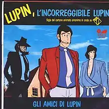 "Lupin, l'incorreggibile Lupin" (Lupin, the Incorrigible Lupin) is a theme song written by Alessandra Valeri Manera and Ninni Carucci and sung by a fictional music group called "Gli Amici di Lupin" (The friends of Lupin), which is composed by Enzo Draghi (vocals) and Simone D'Andrea (Sei furbo Lupin! sentence). It is the Italian theme song of Lupin the Third anime series used from 1987. From 2004 the song is replaced by Giorgio Vanni's Hallo Lupin in the first and second anime series, whereas third anime series kept the Lupin, l'incorreggibile Lupin song.
