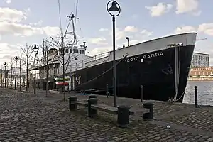 In February 2014 she was moved by Waterways Ireland to the Grand Canal Docks' graving dock for deconstruction,[9] but the break-up was postponed due to public opposition and eventually dropped as a plan materialized to convert her to a tourist attraction in her original home port of Galway.[7][4] In 2014, she was the subject of a TV documentary directed by Donncha Mac Con Iomaire on TG4.[10]