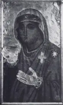 The wood on the painting ground is badly eaten away, but the portrait as a whole, especially the face, the gold nimbus and one hand, are still clearly visible.[2] In later times, Mary's interceding hands were covered with gold sheets to protect them from kisses, and a gold cross was added to the shoulder.[3]