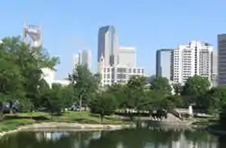 Marshall Park is a 5.5-acre (2.2 ha) urban park at 800 East Third Street in the Second Ward of Charlotte, North Carolina. It features a large fountain and a lake, an amphitheater, a statue of Martin Luther King Jr., and a Holocaust memorial monument. The park contains large open grassy areas with an unobstructed view of the Charlotte skyline. The Park is named for James B. Marshall, Sr., a former Charlotte city manager.[1] Now owned by Mecklenburg County, the park is part of 17 acres (6.9 ha) of land the county is looking to sell to a developer. Under a 2018 agreement, Marshall Park would be replaced with a smaller 1.6-acre (0.65 ha) park.[2]