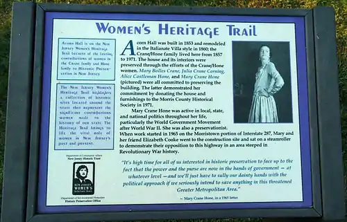 On April 9, 1966, at the age of 61, Hone and friend Elizabeth Cooke climbed into a bulldozer scoop to protest Interstate 287's inevitable destruction of local and historical properties.[15][16] Despite their demonstration, 287 was still completed.[16] This unsuccessful campaign likely inspired Hone to officially join the Morris County Historical Society in 1967.[9]