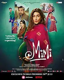 In April 2019, The Times of India reported that Kriti Sanon will lead in a film that will revolve around surrogacy.[5] Dinesh Vijan's production house Maddock Films was reported to back the project. The film was officially announced in August 2019 followed by a poster release and Sanon and Pankaj Tripathi were reported to feature in lead roles. It was further confirmed to be based on the Marathi film Mala Aai Vhhayachy (2011).[6] In an interview with India Today, Dinesh Vijan stated that Mimi was a tale based on true events unlike poignant stories. For him, the film explores a beautiful relationship between a woman who never wanted to be a mother and one who can't wait to be one.[7] The unexpected part was called "humor" in the storyline by him. Sanon added: "You will have a lot of humour and situational humour. At the same time, there are a lot of characters you will take back home."[8] For Sanon, Mimi was the film which she signed hearing the idea but not the script. Later, realising that the role has a lot to offer to her as an actor.[9] She gained fifteen kilograms of body weight to fit into the character of a pregnant woman.[6] In an interview with Hindustan Times, she was quoted: "We had to shoot the pregnancy scenes and Laxman Sir was very clear that it was necessary to gain weight for those scenes because he didn't want the character to have a chiseled face".[6] Actress Sai Tamhankar was roped into playing a pivotal character in the film, sharing screen with Tripathi.[10] She was reported to play a Muslim woman from Rajasthan, hence learnt Urdu as well as the Rajasthani dialect for her role.[11]