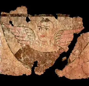 The ruins at Miran consist of a large rectangular fort, a monastery ('the Vihara' in Stein's accounts), several stupas and many sun-dried brick constructions, located relatively close to the ancient caravan track to Dunhuang, running west to east. The many artifacts found in Miran demonstrate the extensive and sophisticated trade connections these ancient towns had with places as far away as the Mediterranean Sea. Archaeological evidence from Miran shows the influence of Buddhism on artistic work as early as the first century BC.[6] Early Buddhist sculptures and murals excavated from the site demonstrate a Serindian style similar to the traditions of western Central Asia and the Gandhara art of the northwest Indian subcontinent;[7] other artistic aspects of the paintings found there suggest that Miran had a direct connection with Rome and its provinces.[8]