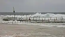 Mona Vale has a shallow beach (formerly known as "Bongin Bongin" Beach)[4] which has a children's and lap pool at its northern end, with the main beach adjoining the golf course and a number of parks and reserves. There is a second beach north of this which is known as "The Basin" with a concentrated wave which, since the early 2000s, has been known as "Whomp" which is popular with body boarders. Mona Vale is a popular beach for surfing with beach breaks including "Main", "Suck Rock" which holds the annual competition known as KOTR or king of the rock, and "Rip Bowl".