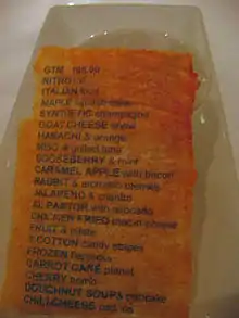 In 2005, Cantu began experimenting with liquid nitrogen to flash-freeze food, and helium and superconductors in an attempt to levitate them. He purchased a class IV laser (the highest grade available) to cook the interior of fish while leaving the outside raw, and create "inside out bread" with a doughy exterior and crusty interior.[3] Later dishes include the "Donut Soup" (an espresso designed to taste like Krispy Kreme doughnut filling) and a sweetbreads and cheese grits dish served with goat-cheese "snow".[2] The 2008 Frommer's guide said Moto's menu was designed to take "dining beyond just eating" with interactive dishes through innovation such as the use of specially designed corkscrew-handled spoons stuffed with herbs to provide aroma as you eat. It also mentioned Cantu's sense of humor in adding smoky aromas to a raw food course.[8]