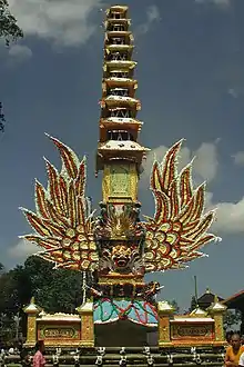 The cremation ceremony was the largest and most ostentatious of the state rituals, attended by all the political dependants of a lord. At the centre of the ritual was the cremation tower (badé) on which the body of the deceased lord rested in state until the whole was consumed in fire. The cremation tower itself symbolized the cosmic order the ritual sought to make real. At its base were the world of demons (winged serpents), above which stood a platform called the House, representing the world of man. Above that were the tiers of roofs symbolizing the world of the gods, to which the deceased was ascending; a commoner would ascend to the first heaven (1 tier), whereas a king to the eleventh.[27]