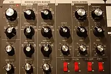 When pure-frequency sine tones were first synthesised into complex timbres, starting in 1953, combinations using inharmonic relationships (noises) were used far more often than harmonic ones (tones).[50] Tones were seen as analogous to vowels, and noises to consonants in human speech, and because traditional music had emphasised tones almost exclusively, composers of electronic music saw scope for exploration along the continuum stretching from single, pure (sine) tones to white noise (the densest superimposition of all audible frequencies)—that is, from entirely periodic to entirely aperiodic sound phenomena. In a process opposite to the building up of sine tones into complexes, white noise could be filtered to produce sounds with different bandwidths, called "coloured noises", such as the speech sounds represented in English by sh, f, s, or ch. An early example of an electronic composition composed entirely by filtering white noise in this way is Henri Pousseur's Scambi (Exchanges), realised at the Studio di Fonologia in Milan in 1957.[51]