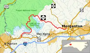 Pisgah Loop Scenic Byway is a 47-mile (76 km) loop byway. The route is not recommended for recreational vehicles or buses, and four-wheel-drive vehicles are required for unpaved portions. NC 126 makes up the southern section of the byway (5 miles (8.0 km)). It is noted for being part of the "Overmountain Victory Trail Commemorative Motor Route" and nearby Lake James State Park. Other roads and highways that make-up the loop are: Fish Hatchery Road (SR 1254 & 1240), NC 181, NC 183, and Old NC Highway 105 (SR 1238, the entire road is unpaved).[2]