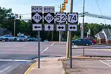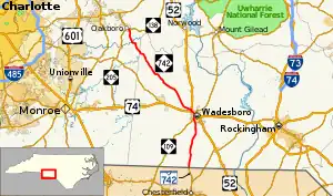 NC 742 was established in 1936 as a new primary routing from US 74 in Wadesboro to NC 205 in Oakboro.[2] Around 1947, NC 742 was extended south, over part of US 74 and NC 109, to the South Carolina state line, where it continues south as SC 742 (originally SC 850).[3] In 1996, the routings of US 52 and NC 742 were adjusted in Wadesboro; they were removed from Salisbury Street and onto a new road further west that crossed over the railroad tracks.[4]