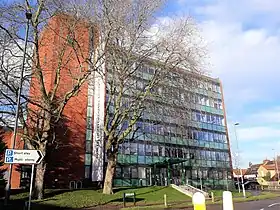 When the council was created in 1974, it inherited five sets of offices from the five former authorities, spread across the four towns of Hitchin, Letchworth, Baldock and Royston. Initially the new council used the former Hitchin Rural District Council's offices (later called Centenary House) on Grammar School Walk in Hitchin as its headquarters, with the other offices providing additional accommodation. In 1975, the year after the new council's creation, it consolidated most of its functions into a new six-storey building called Council Offices on Gernon Road in Letchworth, designed by Tony Walker of architects Damond Lock, Grabowski and Partners. The building was formally opened on 22 July 1975 by Prince Richard, Duke of Gloucester.[16][17] The council rented the building until 2013, when it purchased it for £3.6 million.[18]
