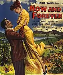 Now and Forever is a 1956 British drama film directed by Mario Zampi and starring Janette Scott, Vernon Gray and Kay Walsh.[2] It is based on the play The Orchard Walls by R.F. Delderfield, and was Scott's first adult role after a career as a child star in Britain.[3] The screenplay concerns an upper-class girl who becomes romantically involved with a garage mechanic, and they head for Gretna Green to elope.