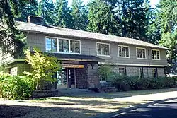 The Olympic National Park Headquarters Historic District overlooks Port Angeles, Washington from Peabody Heights, consisting of 6 contributing buildings built in 1940–44, 8 contributing structures and 17 non-contributing properties that act as the administrative headquarters for Olympic National Park. The contributing structures were built using locally obtained native materials in a late interpretation of the National Park Service Rustic style. Native landscaping enhances the site. Much of the work was carried out by Public Works Administration and Civilian Conservation Corps workers.[2]