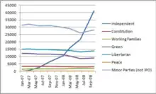 In August 2015, the IPO qualified under Oregon law as a major party with 109,300 members. As a major party, they were provided state-funding for primaries.[44][45] In 2019, the party returned to minor party status reportedly due to the automatic voter registration law increasing the unaffiliated voter count. This subsequently decreased the party's share of the voter population to below the 5% major party threshold.[46] Despite this, the party has continued to grow since it was qualified as a major party.[47]
