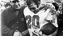 The 1943 Pacific Tigers football team was an independent during the 1943 college football season. In their 11th season under head coach Amos Alonzo Stagg, the Tigers compiled a record of 7–2 and finished the season ranked No. 19 in the AP Poll.[4] The Tigers played home games at Baxter Stadium in Stockton. The Tigers beat a strong UCLA Bruins team, the No. 20 ranked Cal Bears and No. 10 ranked Saint Mary's Gaels. This led the 1943 Tigers Defensive Line to be rated 'the strongest in the West.' The team was at one time ranked No. 6 in the nation by the Associated Press The 1943 team produced Pacific's 1st All-Americans in Tackle Al McCaffrey and Running Back John Podesto. Amos Alonzo Stagg was also named "Coach of the Year" by the American Football Coaches Association and the Football Writers Association of America[5]