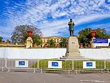 In the 16th and 17th centuries, the area where the palace is currently located was part of a Jesuit farm in the outskirts of Rio de Janeiro. With the expulsion of the Order in 1759, the property was dismembered and passed into private ownership. In the early 19th century, the area known as Quinta da Boa Vista (Good View Estate), because could be seen from there the Tijuca Forest, the Corcovado Hill and the Cajú Beach, belonged to the Portuguese-Lebanese slave merchant, Elie Antun Lubbus, (Elias Antônio Lopes in Portuguese language),[3] who had erected, around 1803, a manor house on top of a hill, from which one had a good view of the Guanabara Bay – which gave rise to the current name of the region. When the Portuguese court was transferred to Brazil, in 1808, Elias António Lopes donated his farm to the prince regent John VI. John VI appreciated the gift and stayed for long periods in the manor house. Before belonging to the monarchy, the residence had nothing special. It was just one of many colonial-style mansions scattered throughout the country. With the arrival of John VI to Brazil, who had left Lisbon fleeing Napoleon in 1808, countless houses in Rio were expropriated to house the Portuguese of the royal entourage. Before his Quinta da Boa Vista was confiscated, the merchant Elias Antônio Lopes hastened to donate it to the king. In thanks for his mime, João VI granted Lopes titles of nobility and a fat indemnity. The mansion underwent countless renovations over the decades. An imposing masonry and cast iron gate was set there. It was built a side tower in Moorish style. There was a semicircular staircase to enter the residence on the second floor. Later, another tower rose, at the opposite end, in neoclassical style. The ladder was destroyed, and the entrance turned to the first floor. The third floor was built. The Moorish tower was rebuilt, which became also neoclassical. The purpose of the changes was to leave the Palace of São Cristóvão to the height of the power of the Brazilian Empire. In 1847, Parliament approved a government bill that would allocate 240 contos de reis to the completion of the reforms. The works seemed to have no end. For Senator Clemente Pereira (PA), Pedro II had to leave Sao Cristóvão, Pereira's proposal was approved, but the government did not even design a new imperial palace.[4]