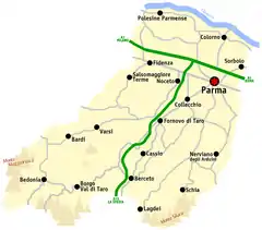 The province is crossed by the Milan-Bologna railroad, one of the most important in Italy, with a station in Parma. The latter is the starting point for the following lines, connecting the city to the Tyrrhenian Sea, Alps and the Po River delta: