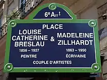 The place is named in memory of German painter Louise Catherine Breslau and French writer Madeleine Zillhardt, by vote of the Council of Paris.[1]