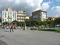 To the west of the square are two remarkable Art Nouveau buildings. The Art Nouveau building at number 8, further south, is the older of the two. It was designed by the architect Andrés López de Ocáriz Robledo, who completed the project in June 1912.[16] The building was promoted by Juan Pazos, a rich emigrant who returned from America, who bought four of the five small 15th-century houses that bounded the square to the west and which were demolished.[17] It consists of a ground floor with double-height arcades, three floors and an attic. Art Nouveau decoration with floral and geometric motifs appears on the main façade above and below the doors and windows, as well as on the central curved pediment with a semicircular arch and on the cornices on either side of it.[16] The building has two large central wrought iron balconies on the first two floors and four side balconies on the third floor. It was completely renovated in 2007 by the architects César Portela and Enrique Barreiro Álvarez.[18]