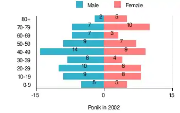 According to the 2002 Poland census, there were 130 people residing in Ponik village, of whom 54.6% were male and 45.4% were female. In the village, the population was spread out, with 17.7% under the age of 18, 34.6% from 18 to 44, 24.6% from 45 to 64, and 23.1% who were 65 years of age or older.[1]